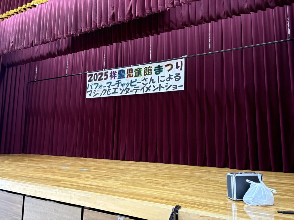 本日は、京都府京都市にある祥豊児童館様主催のお祭りをマジックショーや様々なエンターテイメントで盛り上げてほしいといったご依頼でした。会場にお伺いさせていただくと、以下のように、とても素敵な看板でお出迎えいただきました。