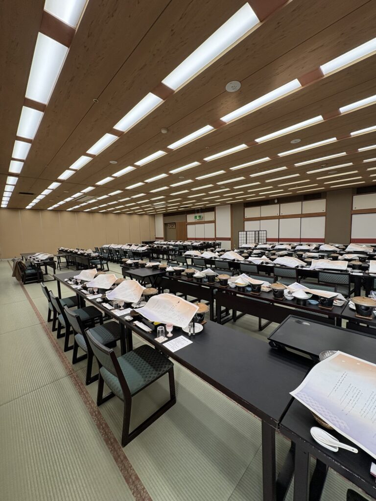 お客様は約100名様。着席形式でお食事を楽しまれていました。